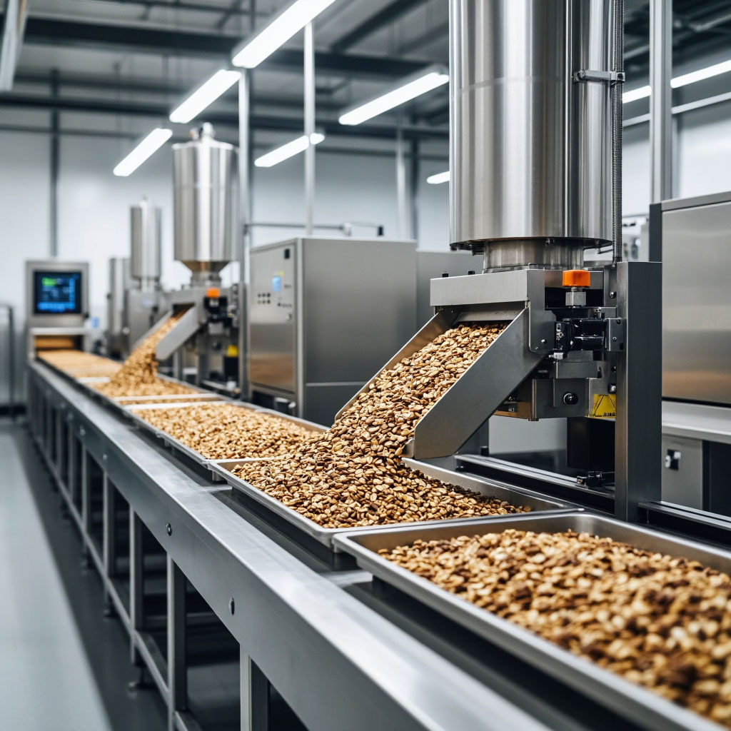 - Автоматическое оборудование для производства батончиков. В приемный бункер поступает еще не закристаллизованная смесь козинака и карамели (козиначное тесто). Козиначное тесто вытягивается валами и происходит формирование пласта. Далее пласт нарезается на заданные размеры.